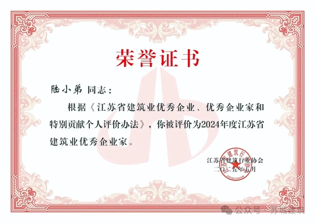 在近日公布的江蘇省建筑業年度評優中,蘇州市蘇城建筑安裝工程有限公司榮獲“江蘇省建筑業優秀企業”稱號,董事長陸小弟先生獲評“江蘇省優秀企業家”!雙項榮譽,彰顯卓越!同時我們衷心感謝各級領導的關懷指導與社會各界朋友們的鼎力支持。這一"雙優"榮譽的獲得,不僅是對蘇城建筑在行業深度調整中保持穩健發展的充分肯定,更是對我們四十多年來深耕建筑領域、堅持創新發展的最佳褒獎!
